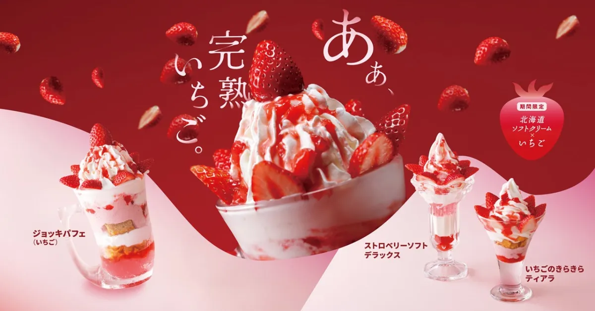 今回提供されるのは、「ジョッキパフェ(いちご)」、「ストロベリーソフトデラックス」、そして「いちごのきらきらティアラ」の3品。いずれも国産の完全に熟したいちごを用いたデザートで、いちごのフレッシュさと甘酸っぱさを感じることができます。