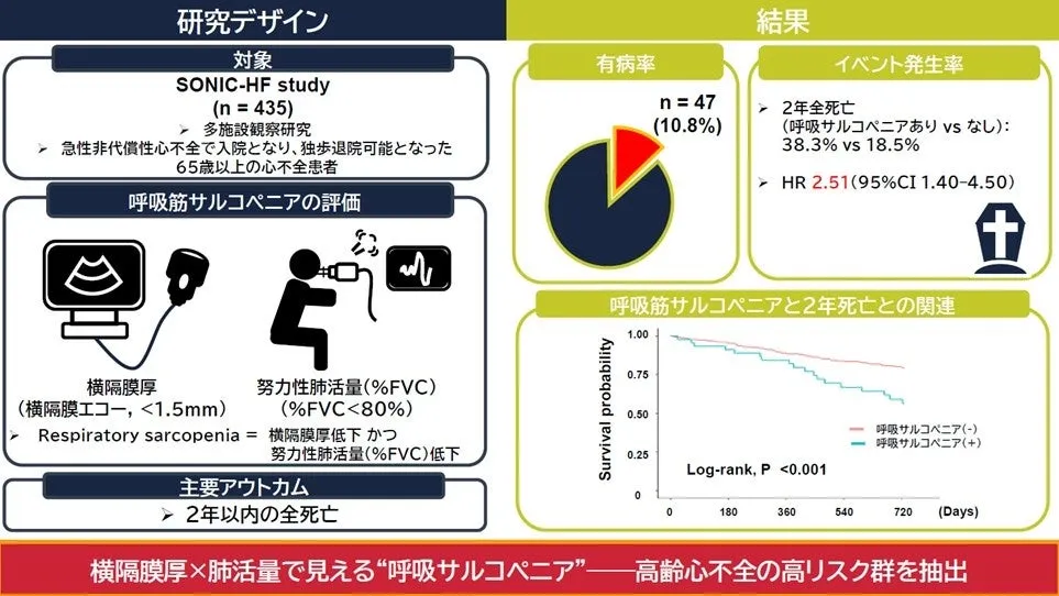 最近、順天堂大学の研究チームが高齢心不全患者における呼吸サルコペニアの有病率とその予後的意義について調査を行いました。この研究は、665名以上の高齢心不全患者を対象にした多施設前向きコホート研究「SONIC-HF」に基づいています。
