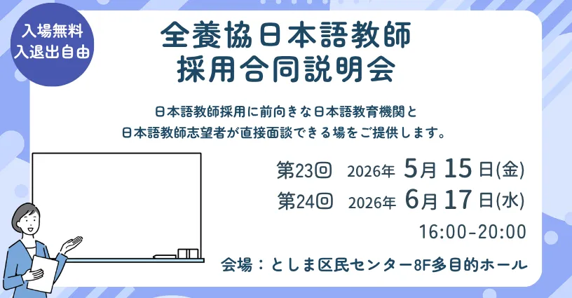 最初のイベントは、2026年5月15日(金)および6月17日(水)に東京・池袋で行われる「第23回全養協日本語教師採用合同説明会」と「第24回全養協日本語教師採用合同説明会」です。具体的な時間は、両日ともに16:00から20:00まで。会場はとしま区民センター8階の多目的ホールです。このイベントでは、日本語教育に関わる様々な教育機関とともに、国際交流基金や国際協力機構が出展予定。