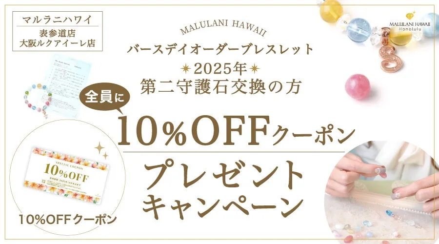 ハワイ発の天然石アクセサリーブランド「マルラニハワイ」では、特別なキャンペーンを実施しています。対象となるのは、バースデイオーダーブレスレットをご購入いただき、第2守護石の交換をされたお客様です。このお客様には、次回のお買い物で利用できる10%OFFのスペシャルクーポンを配布しています。