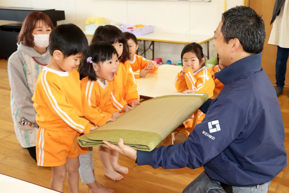 この寄贈は一度きりではなく、毎年継続して行われており、地域に根ざした活動です。提供されるお昼寝マットには、大木町で栽培されたい草が使用されています。これにより地元の産業と子どもたちとをつなぐ素晴らしい贈り物となっています。イケヒコは、今後も自然素材のい草を通じて地域とのつながりを大事にしながら、暮らしに寄り添った取り組みを続けていく所存です。