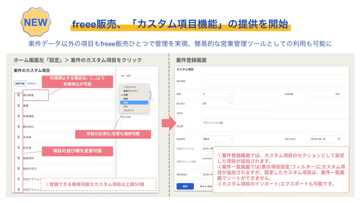 フリー株式会社が提供する販売管理ツール「freee販売」にて、案件ごとにユーザーが自由にカスタマイズ可能な「カスタム項目機能」が新たに導入されました。この機能は、業界や業種を問わず、各社のニーズに応じた情報を一元管理できる点が大きな特徴です。