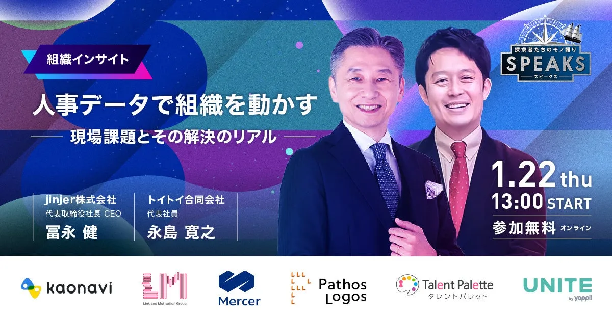2026年1月22日、株式会社ニューピークスが主催する「SPEAKS ーHRリーダーズサミットー」に、jinjer株式会社の冨永健CEOが登壇します。このイベントは「HRイノベーションを学び、ビジネス成長を実現する」というテーマのもと、経営層や人事担当者が集い、最新のトレンドやソリューションを学ぶ貴重な機会となります。