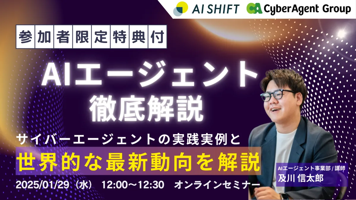 株式会社サイバーエージェントの子会社であるAI Shiftは、AIエージェントに特化したオンラインセミナーを2025年1月29日に開催します。昨今、ChatGPTの登場によって生成AIは私たちの働き方を大きく変革させていますが、その中でも自律的に考え、判断、行動ができるAIエージェントが注目されています。AIエージェントの導入により、企業は業務の効率化に加えて、新たなビジネスの価値創出のもととなる多くの可能性を秘めています。しかし、急速に進化する生成AIの適切な活用法や具体例について理解できている企業はまだ少数です。