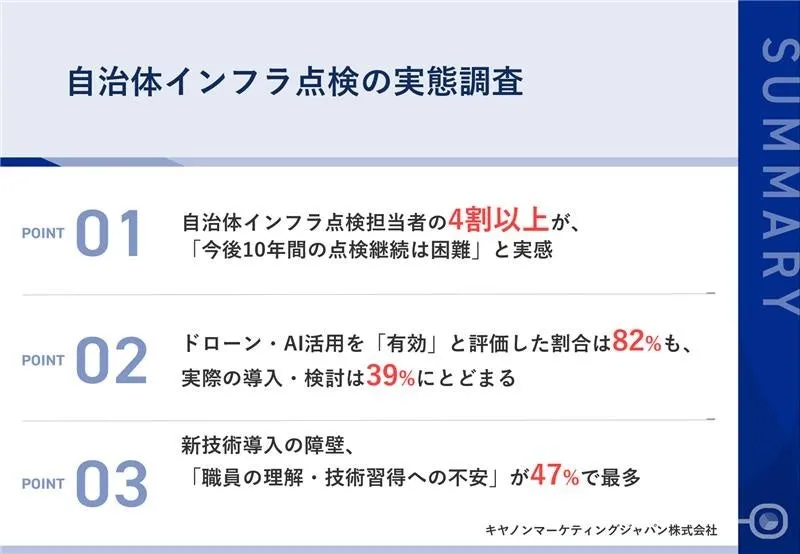 近年、インフラの老朽化が深刻化する中、自治体職員によるインフラ点検の業務はますます重要性を増しています。しかし、キヤノンマーケティングジャパン株式会社(以下、キヤノンMJ)が実施した調査によると、実際には多くの自治体職員が点検を続けることに困難を感じていることがわかりました。その原因や、新技術に対する期待と不安について詳しく探究していきます。