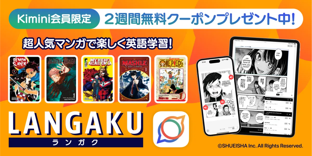 オンライン英会話サービスを提供する『Kimini英会話』が、人気マンガを活用した新たな英語学習方法を提案しています。2025年4月8日から実施されるこの特別キャンペーンでは、英語多読アプリ『Langaku』とのコラボにより、会員に向けた2週間の無料サブスクリプションクーポンをプレゼントします。対象作品には、『鬼滅の刃』『呪術廻戦』『ONE PIECE』『【推しの子】』といった、日本国内外で人気のある作品が含まれています。