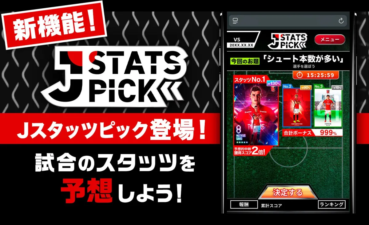 「JSTATS PICK」は、選手を自分で選んでその活躍を予想する参加型のコンテンツで、実際の試合データをもとにランキングが決まります。自分が選んだ選手がテーマに沿って活躍すれば、ボーナススコアが得られ、さらに1位を的中させることで特別なスコアも加算されます。貯めたスコアは、特別仕様のカードや高レアリティのカードと交換できるシステムも完備されています。