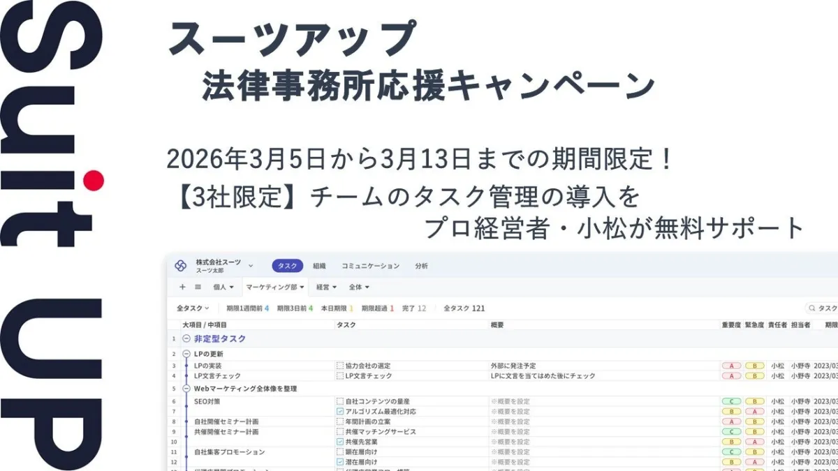 2026年3月5日から13日までの期間中、スーツアップの無料トライアルに申し込んだ法律事務所のうち、先着3社に対して、当社の代表である小松裕介氏が直接チームタスク管理の導入支援を行うという特別なキャンペーンが行われます。このサポートを受けたい方は、専用の問い合わせフォームから応募が可能です。