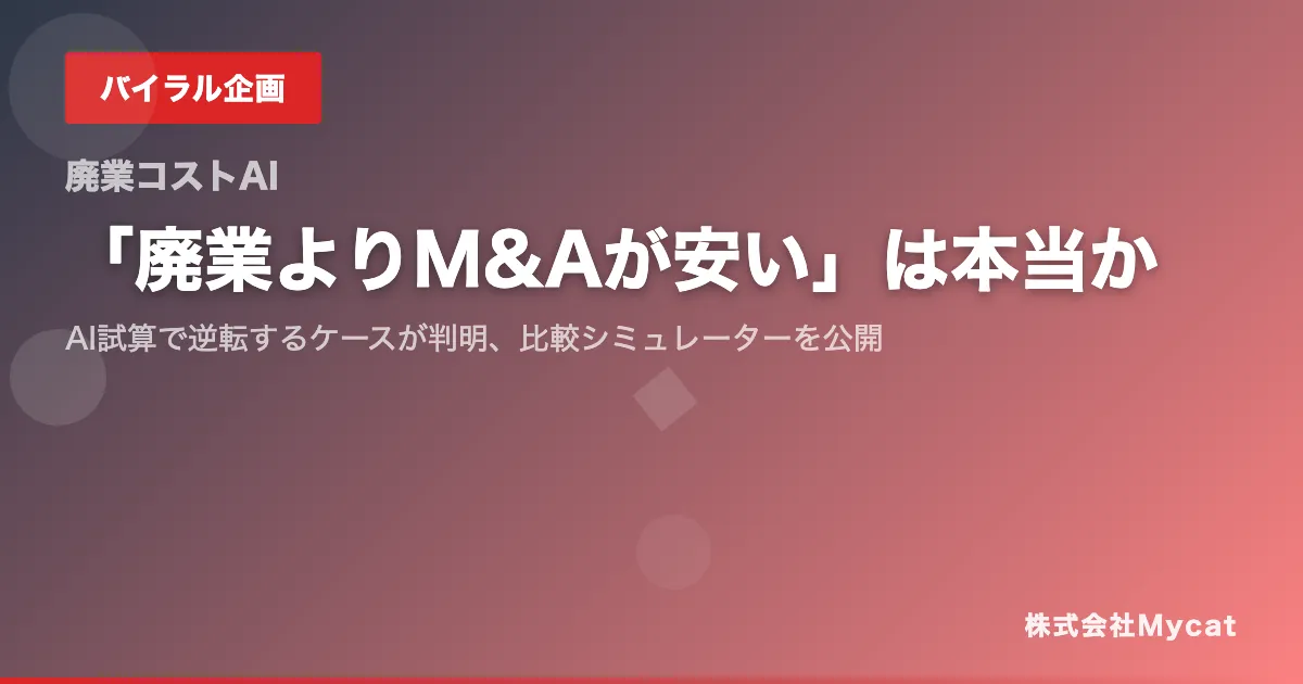 そのような中、株式会社Mycatが「廃業コスト vs M&Aコスト 比較シミュレーター」を公開しました。このツールは、業種、従業員数、賃貸面積など、6つの項目を入力することで、AIが廃業時に発生する原状回復費、在庫処分費、違約金などを自動的に積算します。さらに、M&Aにかかる仲介手数料の相場と一緒に表示されます。