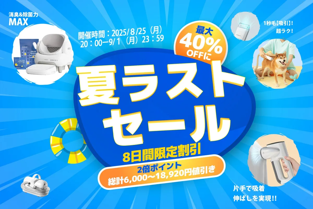 ジェンハイ株式会社が展開するブランド『Neakasa(ネアカサ)』が、夏のラストセールを公式サイトにて開催します。このセールでは、自動猫トイレや衣類スチーマー、防臭ゴミ箱、さらにはグルーミング掃除機などの人気商品が最大40%OFFとなり、値引き額は驚きの18,920円に及びます。特典として全商品がポイント2倍、さらに3,000円以上の購入で送料無料というキャンペーンもあり、オンラインショッピングを楽しむには絶好のタイミングです。