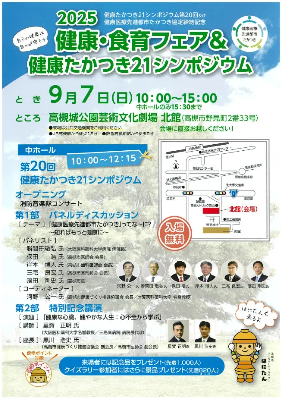 シンポジウムでは、医療の専門家によるパネルディスカッションが行われます。テーマは「『健康医療先進都市たかつき』ってなーに?知ればもっと健康に」。パネリストには、大阪医科薬科大学病院の病院長である勝間田敬弘氏や市医師会会長の保田浩氏など、地元の医療界を代表する専門家が揃います。