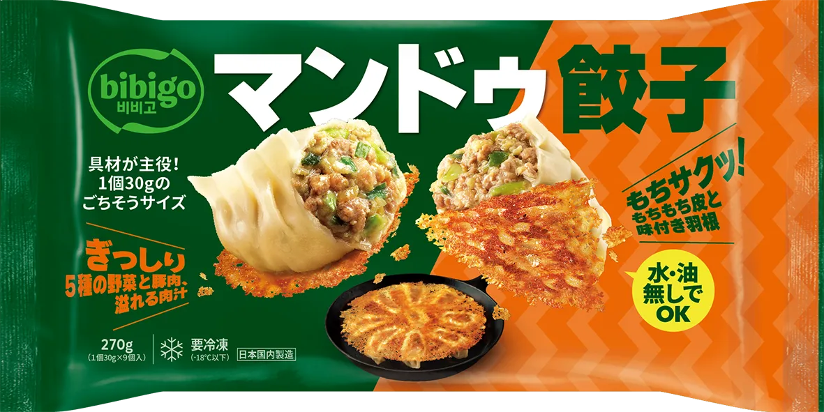 「bibigo マンドゥ餃子」は、1個30gの“ごちそうサイズ”で、マンドゥと餃子の良いところを凝縮した一品となっています。中には5種の野菜と豚肉がバランスよく詰まっており、食べた瞬間に広がる旨みは病みつきになる美味しさです。