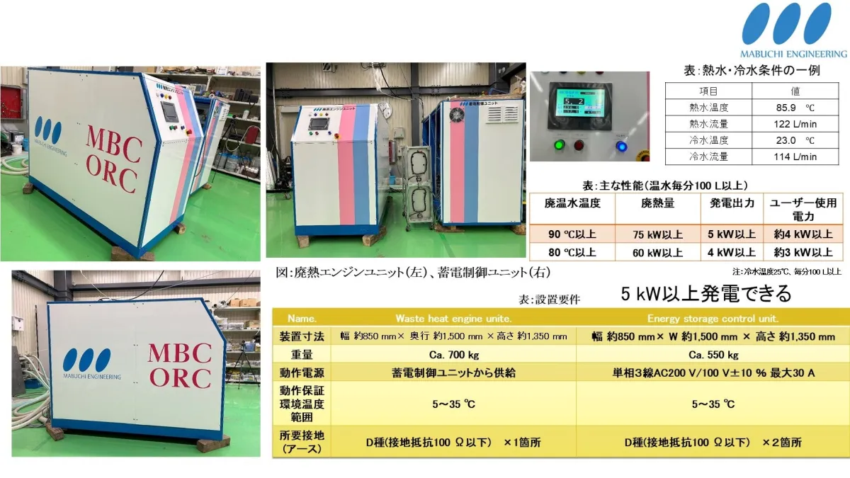 ORC(オーガニックランキンサイクル)発電システムは、廃熱を利用して発電する仕組みを持っています。馬渕工業所のシステムは、80℃以上の廃温水と常温冷水さえあれば発電が可能で、安定して約4.5kWの出力を実現します。さらに、従来の同規模の発電装置に比べ、必要な熱量は60〜75kWと大幅に削減されており、40〜50kWの省エネを達成しています。