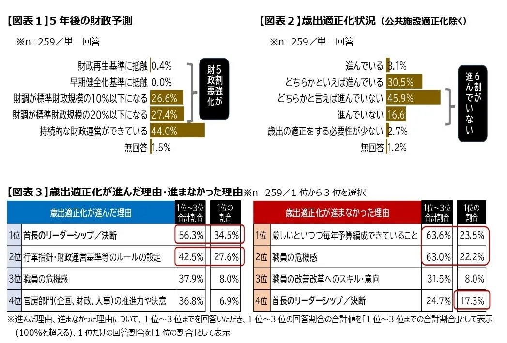 調査結果によると、半数以上の自治体が今後の財政悪化を懸念しており、しかしながら歳出の適正化は進んでいないとのこと。全体の60%が改革に進展がないと回答し、実施の鍵が「首長のリーダーシップ」や決断にかかっていることが明らかになりました。この点が制度実行の成否を分ける大きな要因であることが示されています。