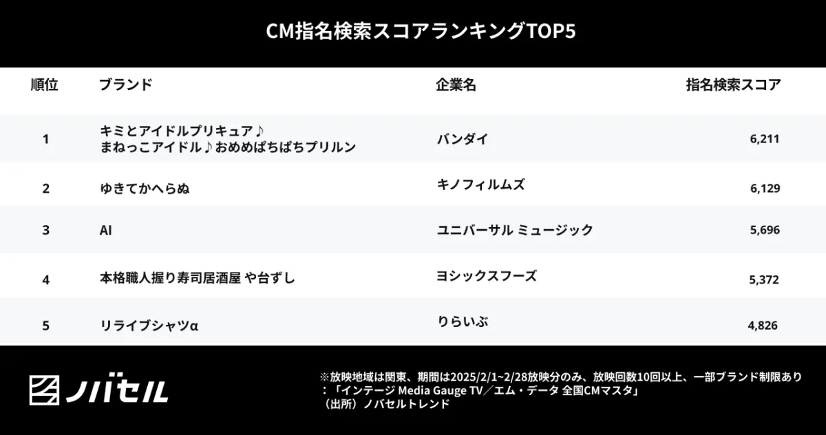 以下は、2月に放映された指名検索スコアが高かったCMのランキングである。