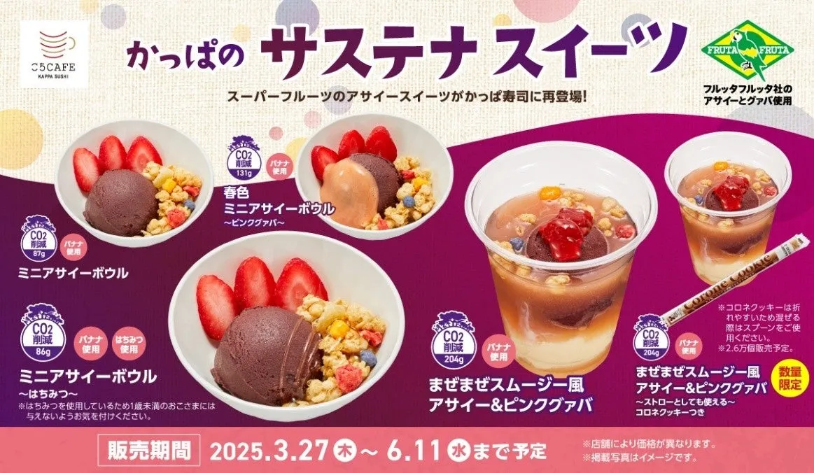 かっぱ寿司が日本で人気のアサイーを使用した新たなスイーツを提供します。株式会社フルッタフルッタがその濃厚なアサイーを使った「アサイースイーツ」を2025年3月27日から6月11日までの期間、全店で販売することが発表されました。この新しいシリーズは、健康志向のスイーツを求める人々にぴったりの一品です。