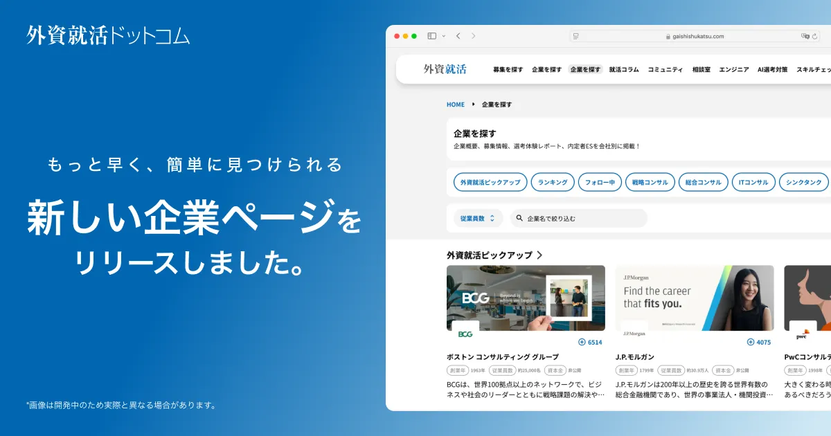 リニューアルによって、外資就活ドットコムの企業紹介機能は今後も進化する予定です。この新システムを導入することにより、より多くの学生にサービスを伝え、優良企業との出会いを創出することを目指しています。今後は新しい切り口での企業紹介が続々とリリースされる予定です。
