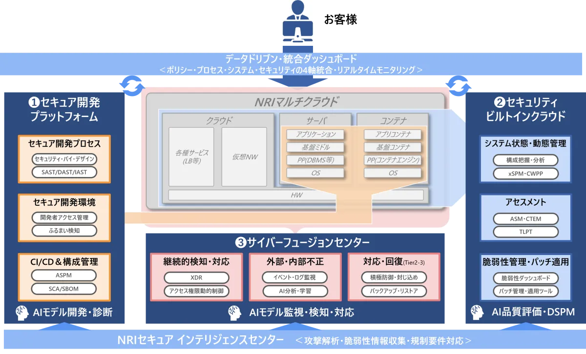 NRIのマルチクラウド環境において、セキュリティ機能を統合し、運用効率を高めることができるクラウド環境を提供します。この環境では、脆弱性の管理や法規制の遵守がシームレスに行え、迅速な対応が可能です。