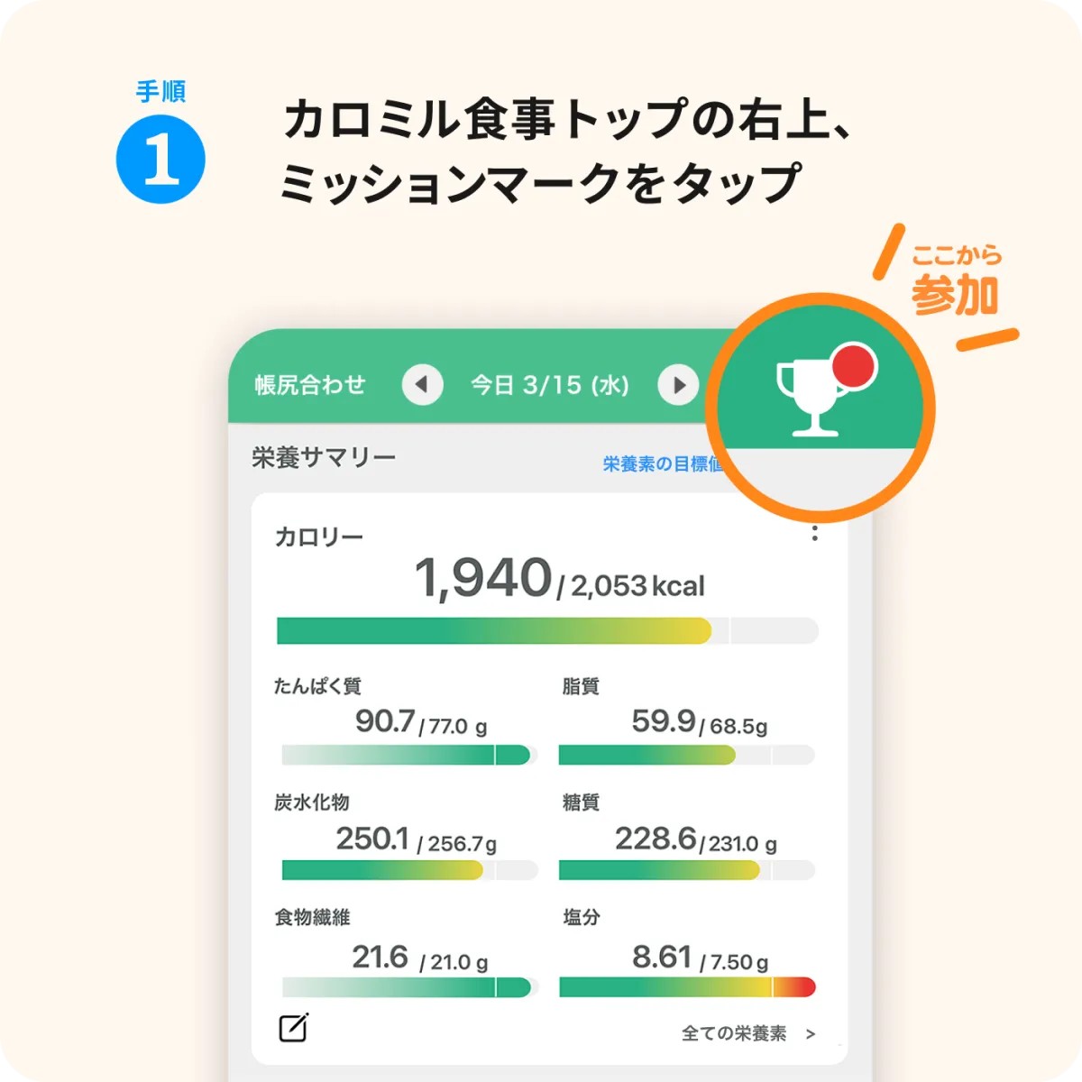 1. カロミルアプリを開き、ミッションセクションにアクセス。