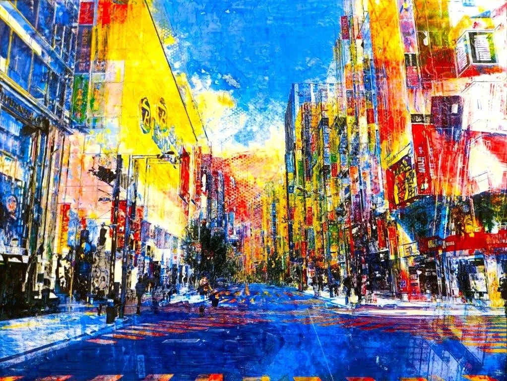 彼の作品は、写真やデジタル画像を駆使し、コラージュすることによって、現代の都市風景を生き生きと描写する独自の手法が特徴だ。熱転写シートを絵の具として使い、鮮やかな色彩で新たな都市の姿を表現している。