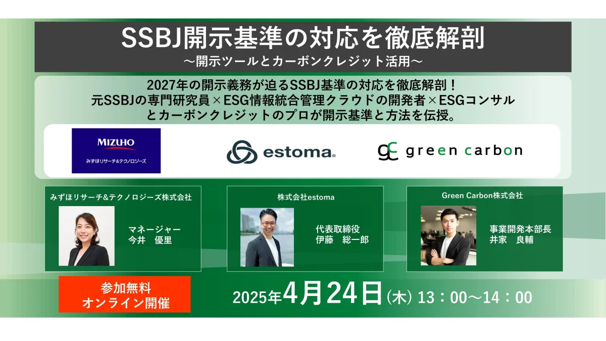 2025年4月24日(木)に、カーボンクレジットを中心とした環境意識の高まりを受け、Green Carbon株式会社が主催する特別なオンラインセミナーが実施されます。このセミナーでは、緊急性の高まる脱炭素化の流れに対応するためのSSBJ(サステナビリティ基準委員会)開示基準について詳しく解説されます。