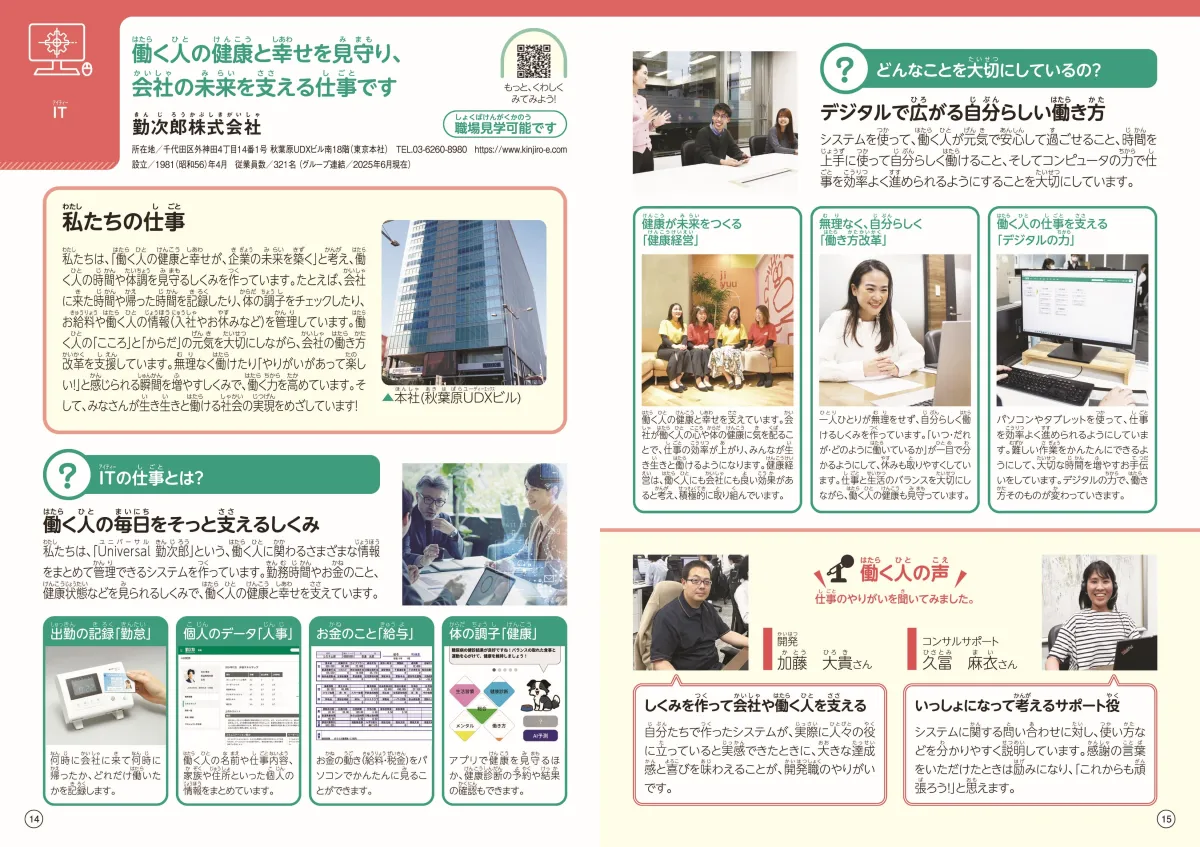 勤次郎株式会社の協賛により、このお仕事ノートは千代田区内の12の小学校に、第三者の支援なしで無償で配布されます。これは、地元の企業として、地域の子どもたちに自社の活動を知ってもらう大事な機会となります。「お仕事ノート」は、子どもたちに将来の選択肢を与え、働くことや多様な働き方についての理解を深めるための重要な教材であると、勤次郎は考えています。