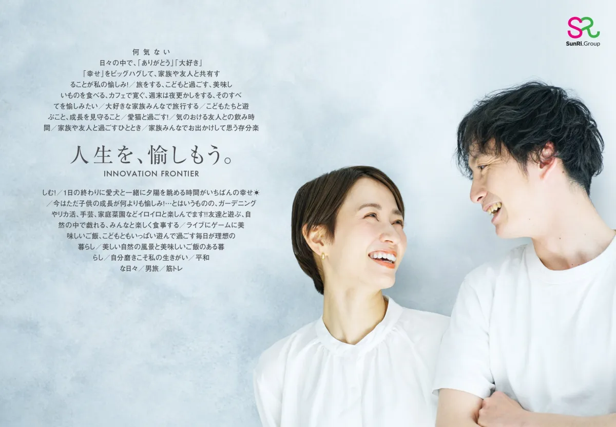 新ブランドのパブリックメッセージは「人生を、愉しもう。」です。サンリーグループは、住まいを通じて暮らしの豊かさを提供し、地域の発展に寄与したいと考えています。住まいの本質に向き合いながら、賃貸や売買、注文住宅といったさまざまなサービスを展開し、顧客一人ひとりのライフスタイルに寄り添います。