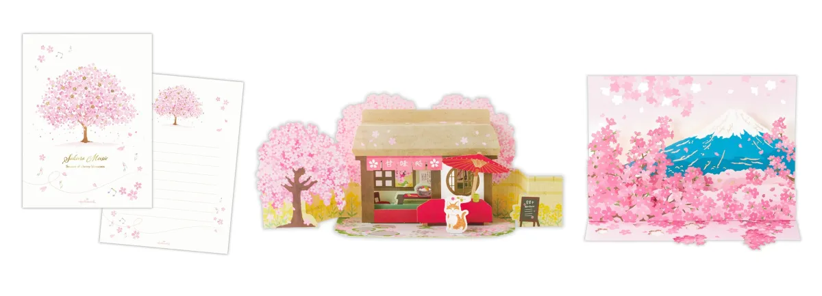 - - 桜の茶屋:立体的なお茶屋の形をしたカードで、可愛らしい看板猫や桜に囲まれたシーンが楽しめます。春のピクニック気分に浸りながら、手紙を書いてみてはいかがでしょうか。