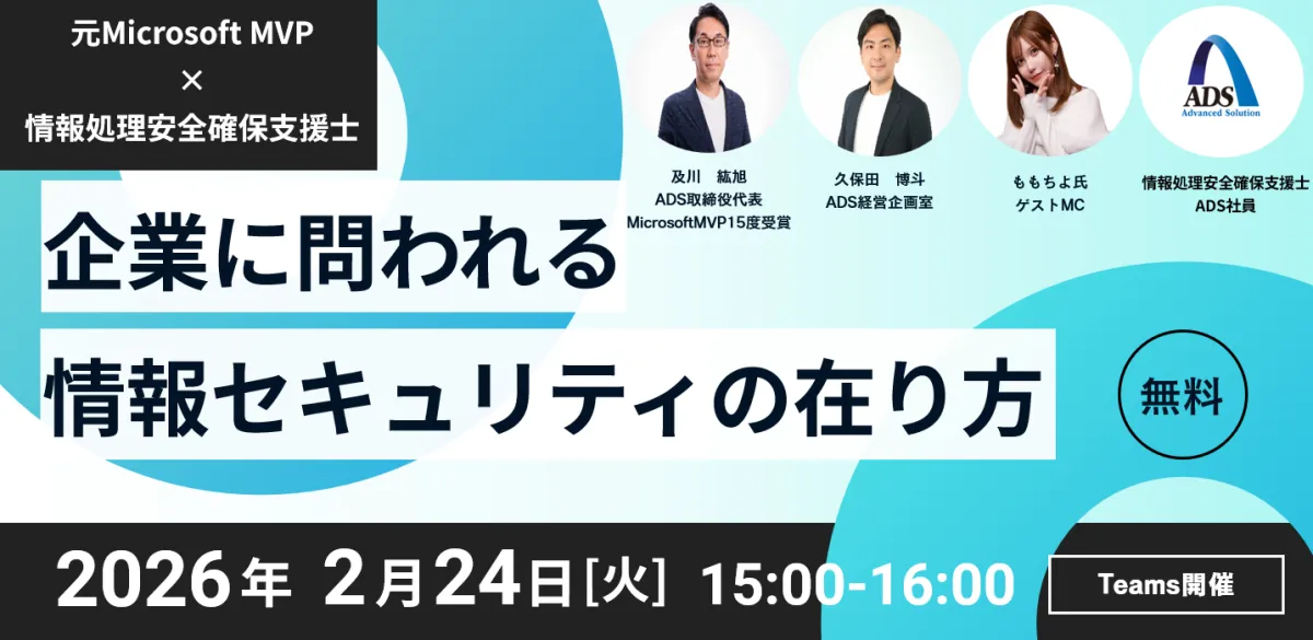 この度、アドバンスド・ソリューション株式会社(以下、ADS)は、2026年2月24日16時より、Microsoftに特化した情報セキュリティの無料オンラインセミナーを開催します。このセミナーでは、Microsoft MVPの15回受賞歴を持つ代表及川紘旭氏と、情報処理安全確保支援士を保有する部門長が登壇し、企業が直面している最新の実務型セキュリティ対策について詳しく解説します。