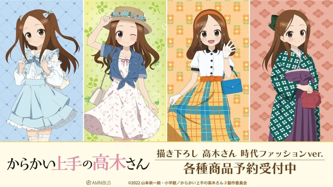 人気作品『からかい上手の高木さん』から新たなオリジナルグッズの受注が始まりました。手掛けるのは、通販サイト「AMNIBUS」を運営する株式会社アルマビアンカ。今回は、時代ファッションをテーマにした全14種の商品がラインアップされており、ファンならずとも見逃せないアイテムが揃っています。