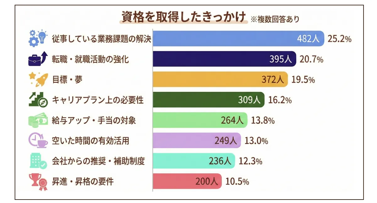 従来、資格を取得する目的は主に「業務上の課題解決(25.2%)」や「転職・就職活動の強化(20.7%)」など、仕事に直結した「実務重視型」が大半を占めていました。これは、多くの人々が資格を職場での立場を強化し、職務を円滑に進めるための手段として捉えていたことを意味します。特に、キャリアアップや転職を目指す多くの求職者にとって、資格はスキルを証明する“守りの道具”として重宝されてきました。