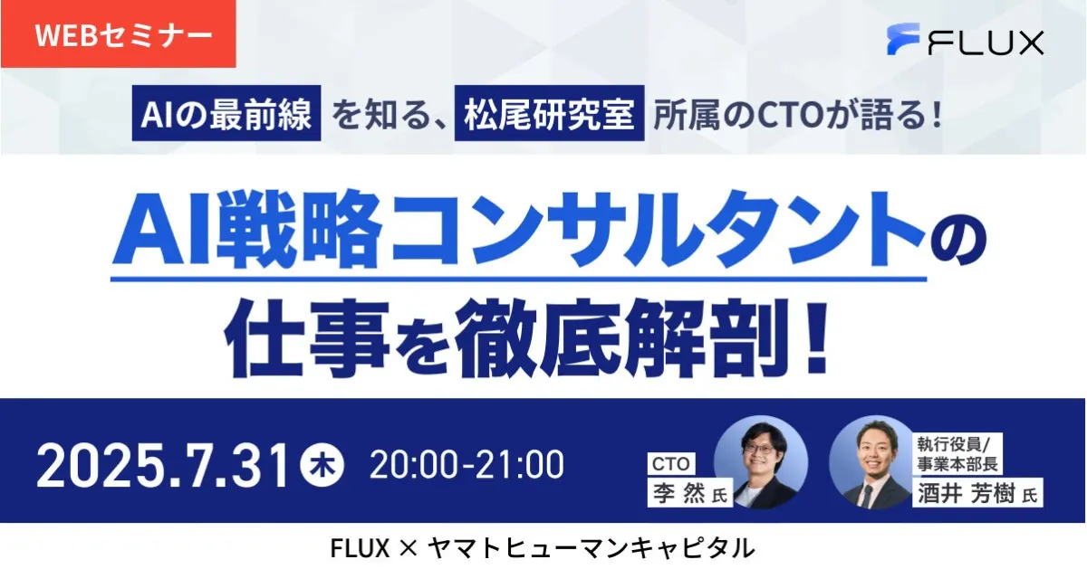 2025年7月31日、ヤマトヒューマンキャピタル株式会社が主催するウェビナー『AIの最前線を知る、松尾研究室所属のCTOが語る!AI戦略コンサルタントの仕事を徹底解剖!』が開催されます。このイベントでは、株式会社FLUXのCTOである李 然氏と、執行役員で事業本部長の酒井 芳樹氏が登壇。