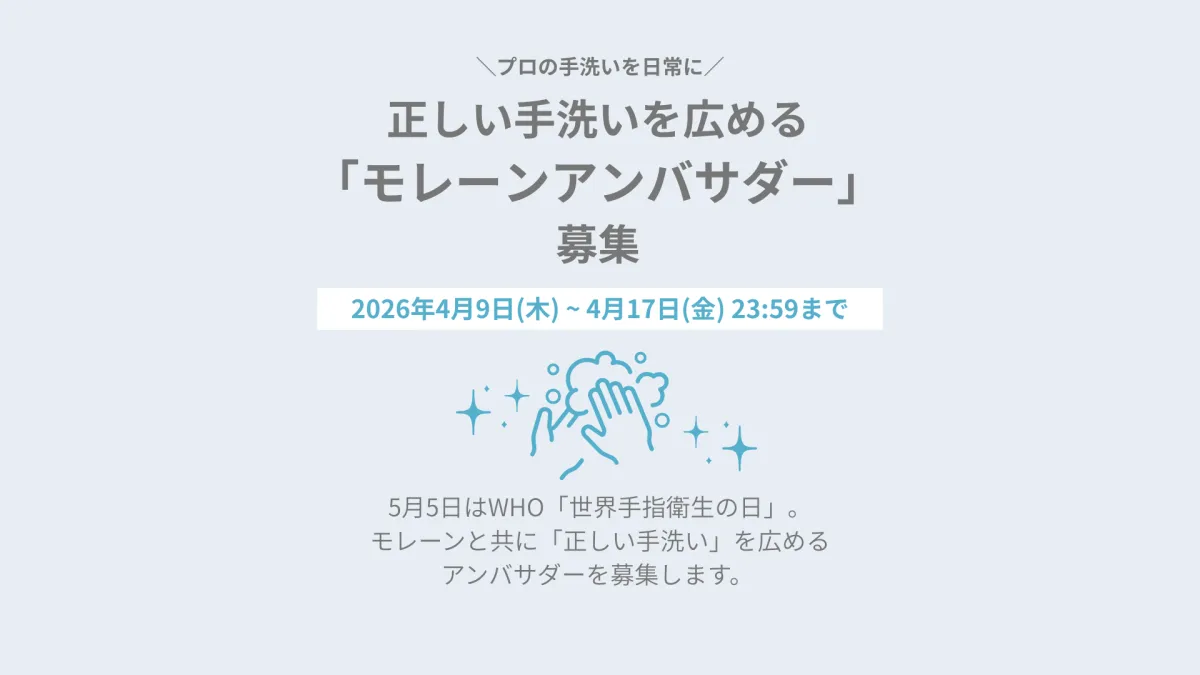 モレーンコーポレーション(東京都中野区)は、WHOが定める「世界手指衛生の日」に合わせて、新たな啓蒙活動を始めます。感染対策を専門とするこの会社は、3ヶ月間にわたる「モレーン手指衛生アンバサダー 2026」の一般公募を開始しました。注目すべきは、感染管理のスペシャリストである「しんじ@感染症ナースマン」さんとのコラボレーションです。このプロジェクトは、医療現場の知識を一般家庭や施設に伝え、手指衛生の重要性を再認識させることを目的としています。