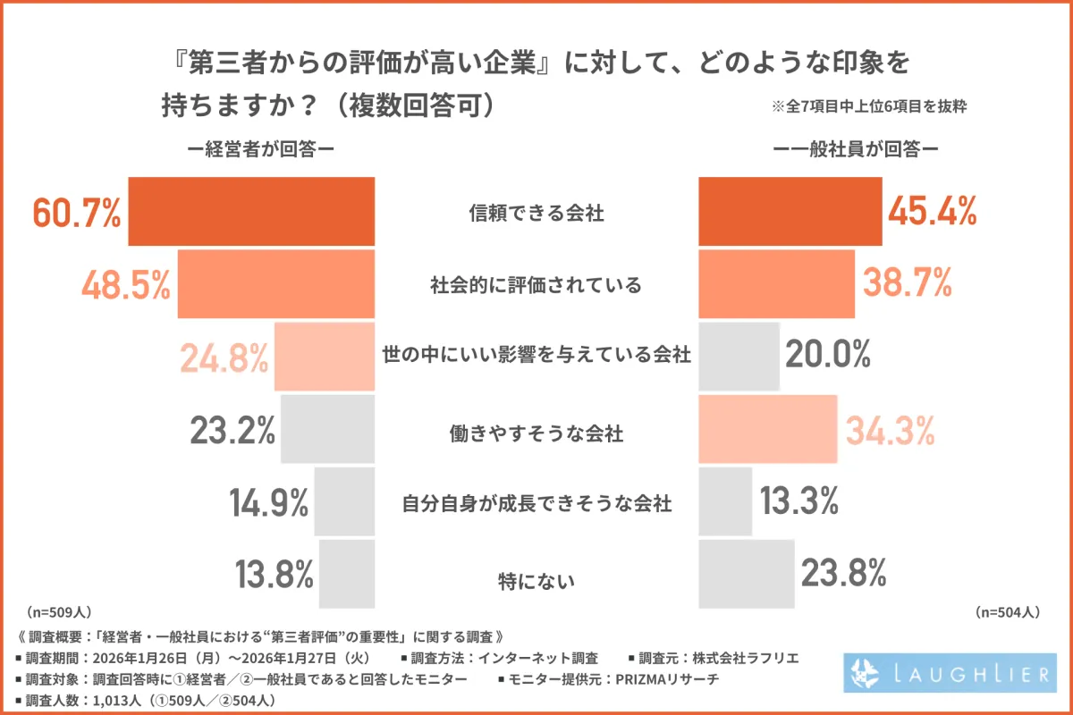 調査の結果、経営者の60.7%が「第三者から高く評価される企業」に対し「信頼できる会社」と考えており、一般社員も45.4%が同じ見解を示しました。このことは、企業評価が信頼を得るための鍵となっていることを示しています。