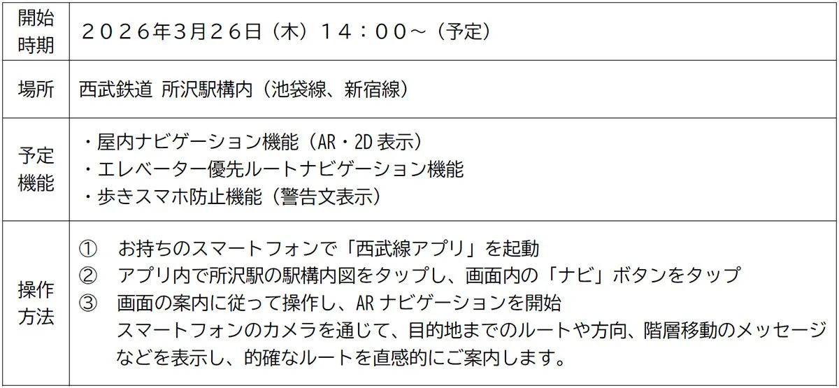 ARナビゲーション機能は、「西武線アプリ」に組み込まれ、所沢駅内で試験的に運用されます。この機能は、駅構内での動線や目的地までのルートをリアルタイムで案内するものです。これまでの静的な地図情報ではなく、ダイナミックな案内を提供することが目的です。