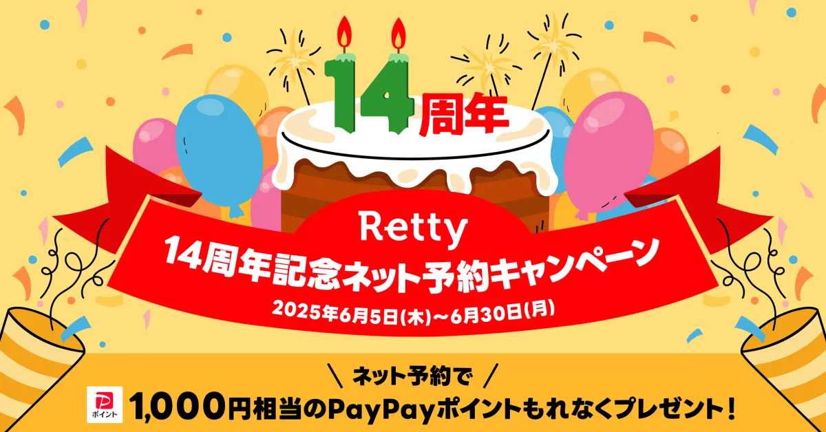 グルメ情報・予約サイト「Retty(レッティ)」は、2025年6月5日から6月30日まで、「14周年記念ネット予約キャンペーン」を実施します。このキャンペーンでは、対象店舗にネット予約を通じて2名以上で来店した方に、もれなく1,000円相当のPayPayポイントが付与されるというお得な内容です。