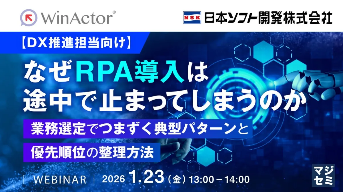 企業の業務効率を向上させる手段として急速に注目を集めているRPA(ロボティック・プロセス・オートメーション)。しかし、現場では期待に反して導入が進まない企業が増加しています。このような状況を打破するために、日本ソフト開発株式会社は「RPA導入を途中で止めてしまう理由」について深掘りするウェビナーを開催します。
