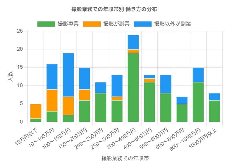 年収に関しては、最も多くのフォトグラファーが「100万〜300万円」の世代に該当しています。将来の目標としては「400万〜600万円」や「1,000万円以上」を目指すフォトグラファーが多い一方で、現実とのギャップに悩む声も聞かれます。