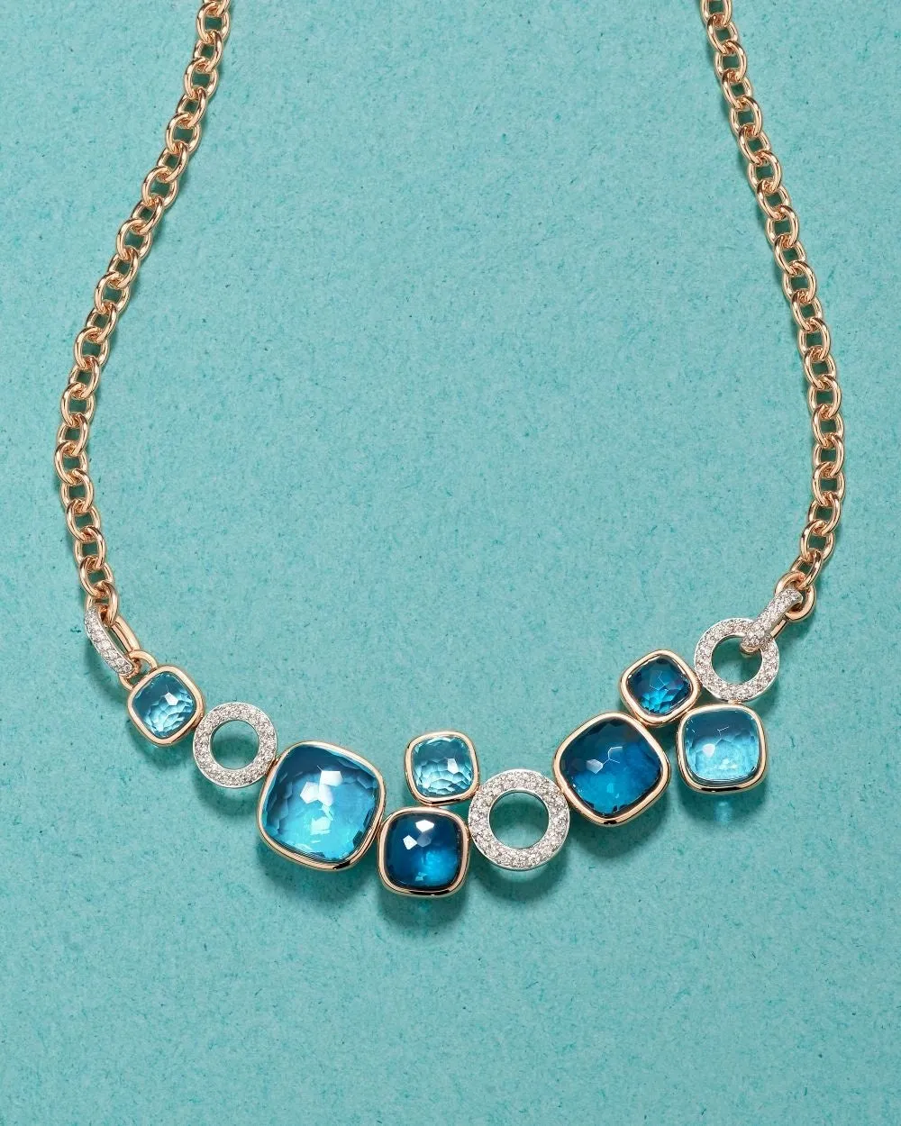 さらに、ロンドンブルートパーズとスカイブルートパーズがアシンメトリーなリズムを生み出し、身体の動きにフィットするデザインが施されています。快適さと美しさを兼ね備えたこのネックレスは、着けることで自信を与え、高揚感をもたらします。
