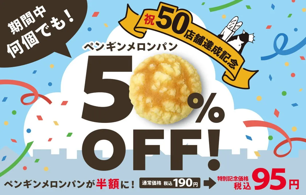 株式会社ペンギンが運営する「ペンギンベーカリー」が、全国での店舗数が50に達成したことを祝して、特別なキャンペーンを行います。人気商品である『ペンギンメロンパン』が、なんと50%OFFの特別価格で販売されるのです。