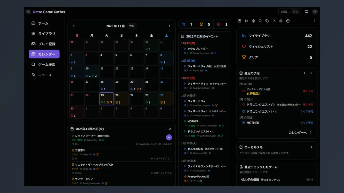 今回のバージョンでは、カレンダー機能を新たに追加し、自分のゲーム体験を時系列で振り返ることが可能になりました。月次カレンダーには、ゲームの購入日、プレイ中のゲームのクリア予定日などの「イベント」が表示され、視覚的に記憶を甦らせる役割を果たします。これにより、太字で語られる「遊んだ記憶」がより鮮明になることが期待されます。