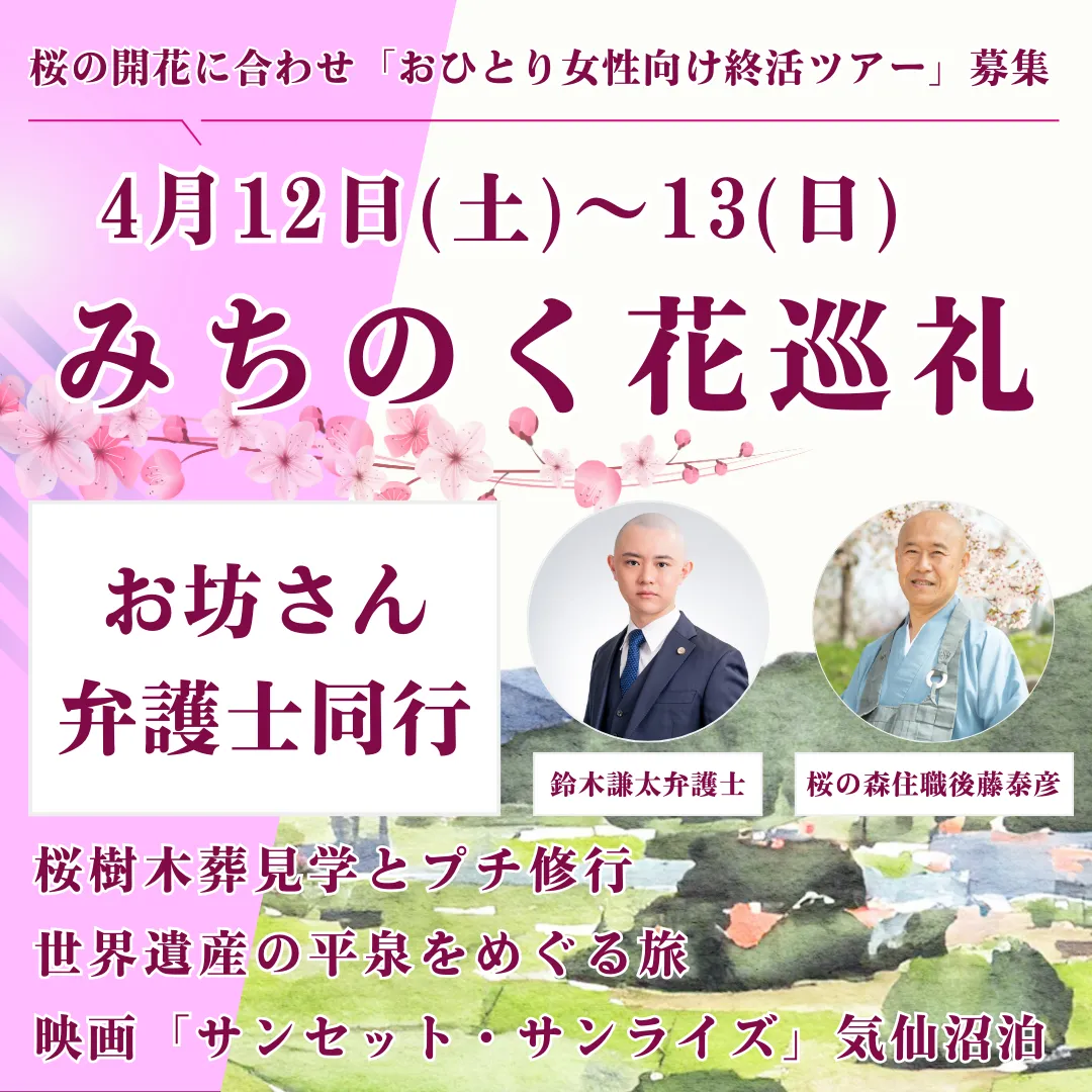 4月12日(土)~13日(日)の2日間、宮城県石巻市にて女性向けの終活ツアーが実施されます。このツアーは、一般社団法人てあわせが開催し、曹洞宗のお坊さん弁護士、鈴木謙太さんが同行する特別な企画です。参加者は、桜の開花に合わせた花巡礼と桜樹木葬の見学を通じて、人生の終わりについて自ら考える機会を得ます。
