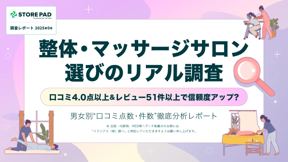 イクシアス株式会社が運営するAI搭載型の店舗情報分析プラットフォーム「ストアパッド」は、東京都や神奈川県、千葉県、埼玉県の21歳から59歳の3,000人を対象に整体・マッサージサロンの利用に関するアンケート調査を実施しました。この調査の目的は、近年の整体・マッサージサロンの選び方の動向や、口コミがどのように影響を与えるかについて明らかにすることでした。