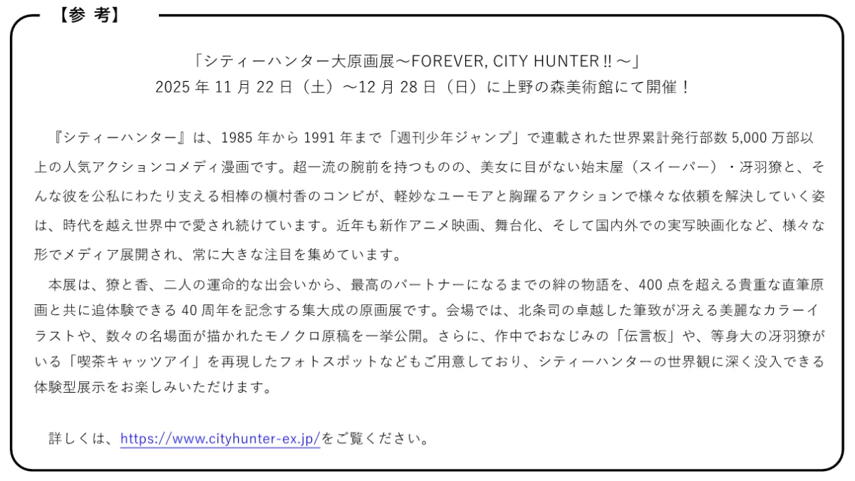 2025年11月22日から12月25日まで、シティーハンターの大原画展を記念して、東京メトロが「デジタルクイズラリー」を開催します。このイベントは、漫画「シティーハンター」が連載開始から40周年を迎えるにあたり、上野の森美術館で行われる原画展「シティーハンター大原画展~FOREVER, CITY HUNTER‼~」に合わせたものです。