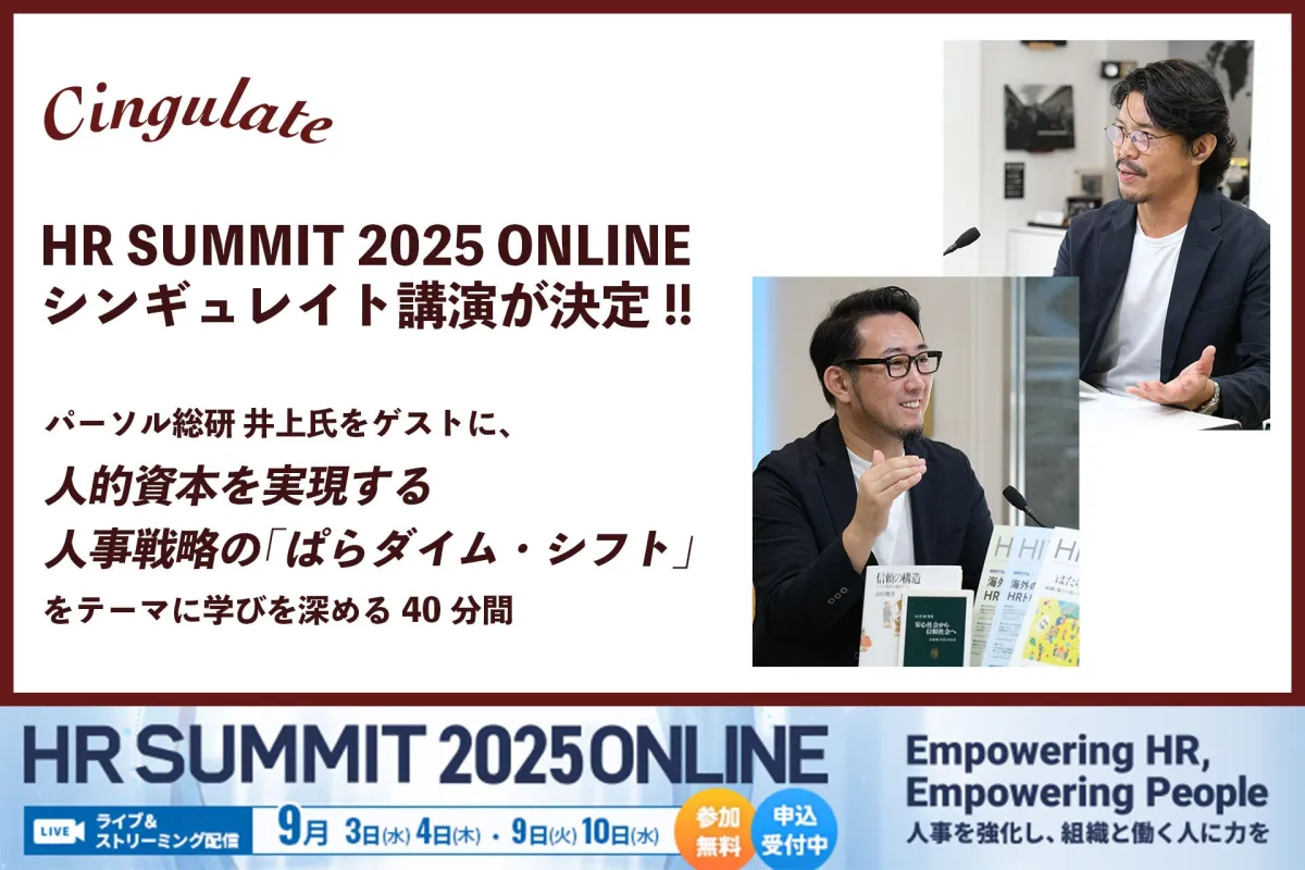 2025年9月10日(水)、オンライン開催される「HR SUMMIT 2025」で、株式会社シンギュレイトの講演が行われます。この講演では、パーソル総合研究所の井上亮太郎氏を迎え、"人的資本を実現する人事戦略の「ぱらダイム・シフト」"というテーマで講演され、15:40から16:20の間、40分間にわたり深い知見が共有される予定です。