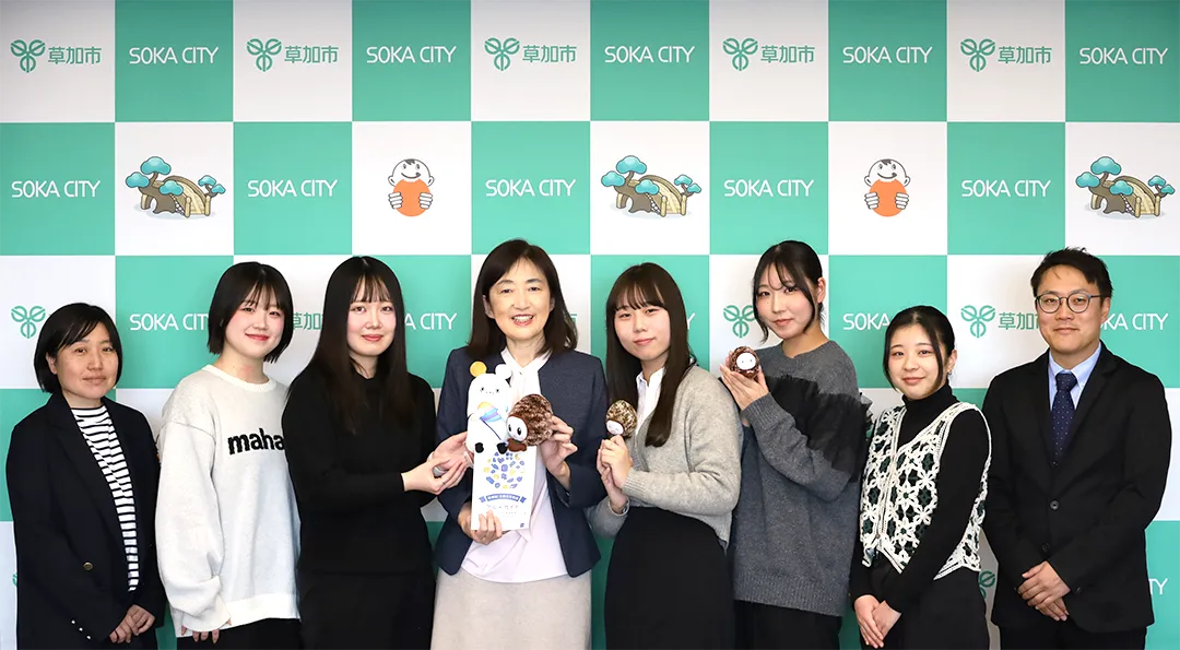 このグルメガイドの発行を祝うため、2月10日には草加市役所本庁舎で懇談会が行われました。出席者には市長の山川百合子氏や市役所の職員、そしてゼミの学生たちが参加しました。懇談会では、青木洋高先生がこのガイドの経緯や狙いを説明した後、市長から地域に対する質問が投げかけられ、参加者同士の和やかなディスカッションが展開されました。