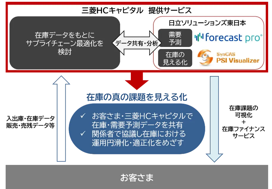 新しい在庫点検サービスでは、三菱HCキャピタルが中心となり、顧客の入庫や出庫、在庫実績のデータをもとに「SynCAS PSI Visualizer」を利用して在庫状況を可視化します。さらに、「Forecast Pro」を使用して需要予測を行い、在庫を分析・評価します。こうした分析によって明らかになった在庫の問題点に対して、適正在庫の実現に向けた具体的な改善策を提案します。