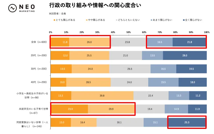 広報紙を読まない理由の中で最も多かったのは「存在を知らなかった」という回答で、32.0%と高い数字を示しています。特に20代の若年層では39.5%がこの理由を挙げており、認知度の低さが課題であることが浮き彫りになっています。対照的に、子育て世帯では関心層が53.8%と非常に高く、政府からの情報が直接的な生活に影響を与えることが、関心を促進していると考えられます。
