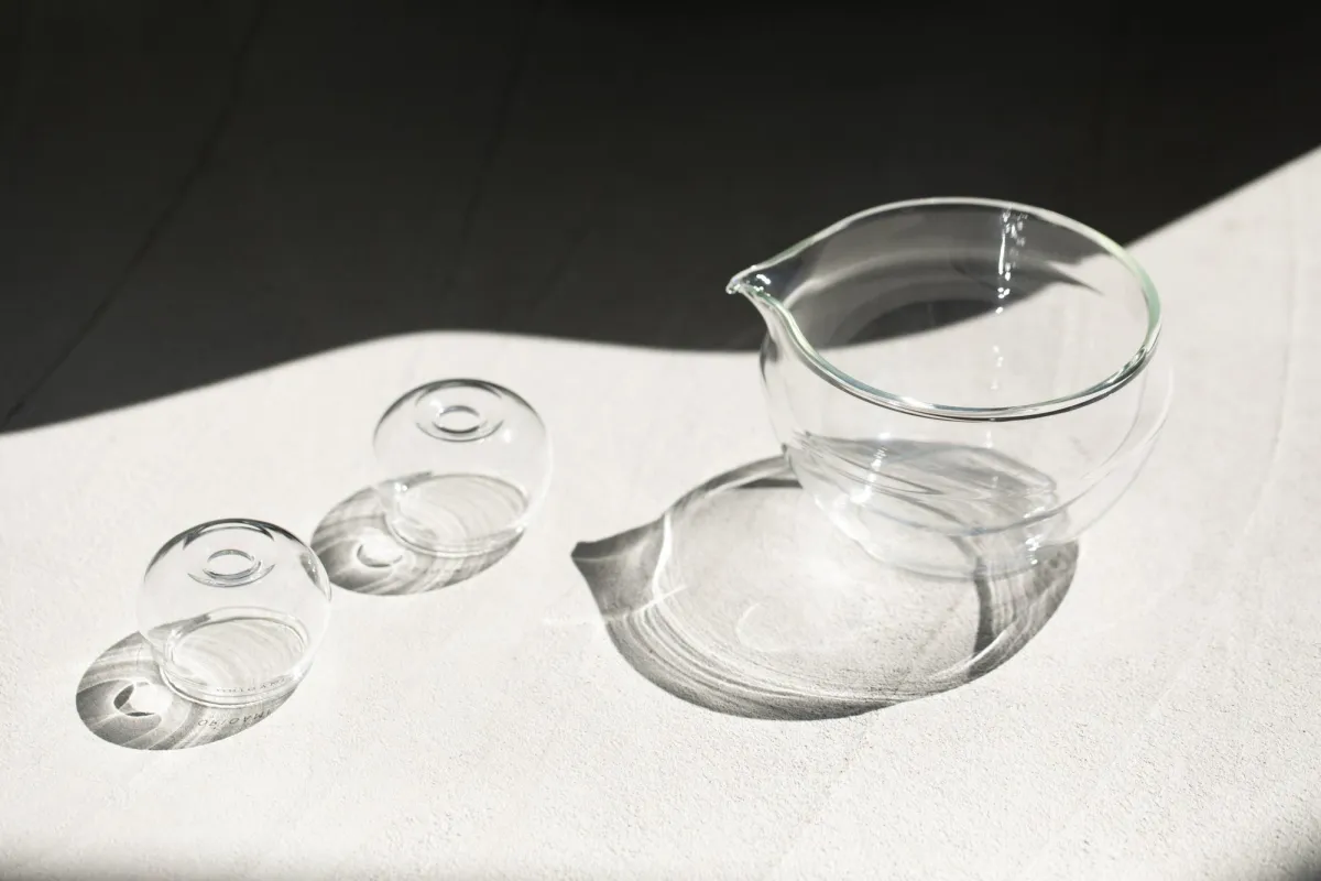 このガラス製の抹茶碗や茶筅立ては、単なる道具以上の役割を果たすことを目指しています。茶筅が動き、抹茶が混ざり合い、泡が立つ様子をガラス越しに観察できることで、「点てる」という行為が一つの美しい表現として際立ちます。