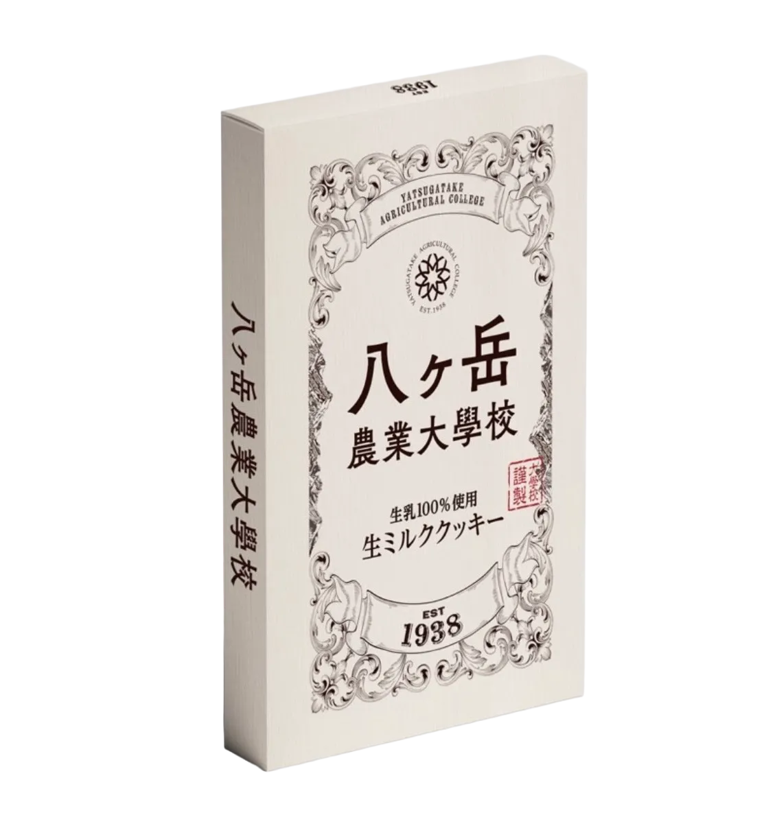 "生ミルククッキー"のパッケージデザインは、八ヶ岳の自然と128年の伝統を尊重した内容で仕上げられています。中央に配置されたエンブレムや八ヶ岳の山並みが特徴的で、優しいベージュトーンの配色が自然の優しさを表現しています。